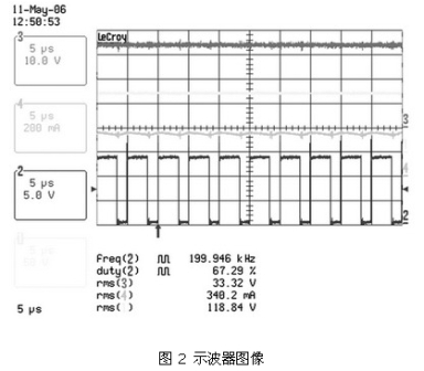 圖 2 、圖3 及表 2、表3 顯示了這種電路在90 ~265 VAC的通用輸入電壓范圍內(nèi),以350 mA驅(qū)動(dòng)兩個(gè)有6個(gè)串聯(lián)LUXEON FLOOD 25-0032 HB-LED板時(shí)的結(jié)果。表 2 顯示了在輸入電壓范圍內(nèi)良好的電流調(diào)節(jié)。圖 2 和圖3 說明了正如理論所示的,由于占空比較小,輸入電壓較高時(shí)紋波較差。這表明在主電壓較低的地區(qū),如北美和日本,設(shè)備性能更加良好。然而,即使在最差的條件下,只要控制器輸入電壓保持在90 ~265 VAC的范圍內(nèi),仍可對電流進(jìn)行適時(shí)調(diào)節(jié)。同時(shí)對只使用6個(gè)HB-LED板的系統(tǒng)進(jìn)行了測量(見表 3) ,對比結(jié)果發(fā)現(xiàn),±1.3%的調(diào)節(jié)差距導(dǎo)致負(fù)載電壓的差距高達(dá)33.4V ~16.4V。