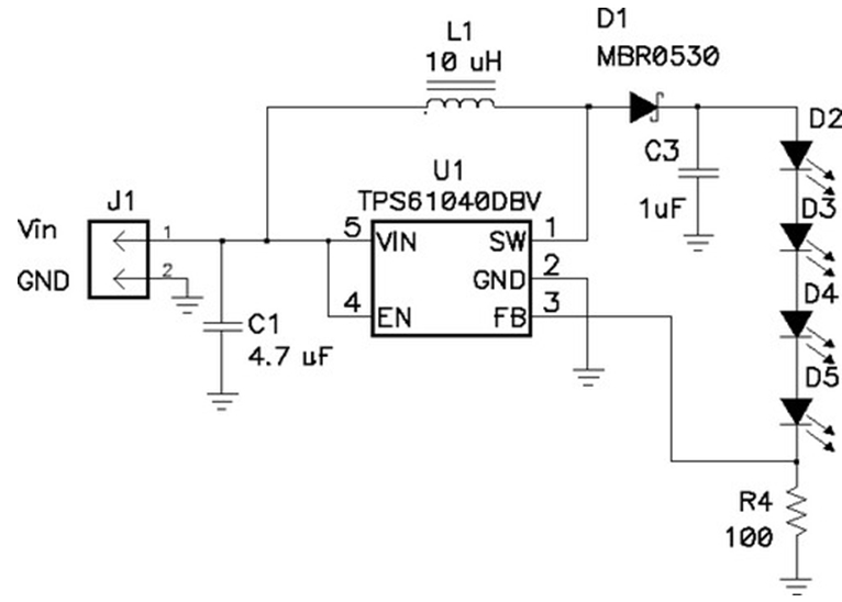 當輸出電壓總是比輸入電壓大時,最好采用升壓轉換電路,如圖6所示。該電路的U1有一個帶有控制電子器件的高度集成的電源開關。當開關閉合時,電流流過電感器到接地。當開關斷開時,U1的引腳 1 電壓會升高,直到D1導通。然后電感器放電,電流進入輸出電容器(C3)和LED串。在絕大多數應用中,C3通常用于平滑LED電流。如果沒有C3,則 LED電流將是斷斷續(xù)續(xù)的。也就是說,它會在零和電感電流之間切換,這會導致 LED 熱量增加(從而縮短使用壽命),亮度減少。在前面的例子中,LED 的電流是通過一個電阻感測的,并且占空比會發(fā)生相應的變化。請注意,本拓撲存在一個嚴重的問題,即它沒有短路保護電路。若輸出短路,則會有較大的電流通過電感器和二極管,從而導致電路失效,或者輸入電壓崩潰。
