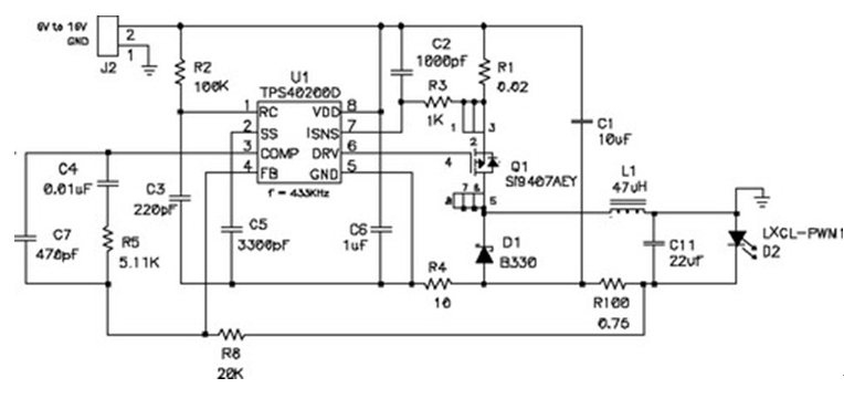 在輸出電壓始終小于輸入電壓的情況下,應使用降壓穩(wěn)壓器,圖5顯示了該拓撲結構。在該電路中,對電源開關的占空比 (duty factor) 進行了控制,以在輸出濾波器電感 L1 上確立平均電壓。當FET開關閉合時(TPS5430 內部),其將輸入電壓連接到電感器,并在L1中構建電流。D2為環(huán)流二極管 (catch diode),可提供開關斷開時的電流路徑。電感器可對流過LED的電流起到平滑的作用,該工作可通過用電阻監(jiān)控(測量)LED電流,并將電壓與控制芯片內部的參考電壓進行比較,最終進行調節(jié)。如果電流太低,則占空比增加,平均電壓也上升,從而也導致了電流的升高。該電路具有極佳的效率,因為電源開關、環(huán)流二極管以及電流感測電阻上的壓降非常低。