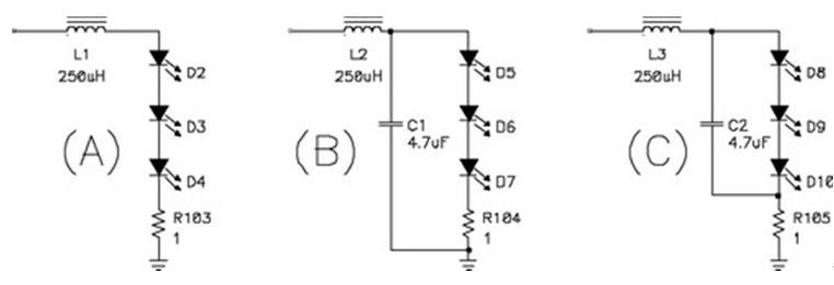 關閉 LED 電源上的電流環(huán)路比關閉傳統(tǒng)電源上的電壓環(huán)路簡單。環(huán)路的復雜性取決于輸出濾波器的配置。圖8顯示了三種可能的配置:只有一個簡單電感器的濾波器(A);一個典型的電源濾波器(B);以及一個修正后的濾波器(C)。