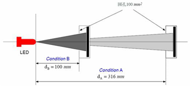 如圖4所示,點(diǎn)光源光強(qiáng)在空間各方向均勻分布,在不同距離處用不同接收孔徑的探測器接收得到的測試結(jié)果都不會(huì)改變,但是LED由于其光強(qiáng)分布的不一致使得測試結(jié)果隨測試距離和探測器孔徑變化。因此,CIE-127提出了兩種推薦測試條件使得各LED在同一條件下進(jìn)行光強(qiáng)測試與評價(jià),目前CIE-127條件已經(jīng)被各LED制造商和檢測機(jī)構(gòu)引用。