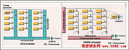由于構(gòu)造上的基本差異,我們可以表列出兩者在性能上的表現(xiàn)之不同。CCD的特色在于充分保持信號(hào)在傳輸時(shí)不失真(專屬通道設(shè)計(jì)),透過(guò)每一個(gè)畫素集合至單一放大器上再做統(tǒng)一處理,可以保持資料的完整性;CMOS的制程較簡(jiǎn)單,沒(méi)有專屬通道的設(shè)計(jì),因此必須先行放大再整合各個(gè)畫素的資料。