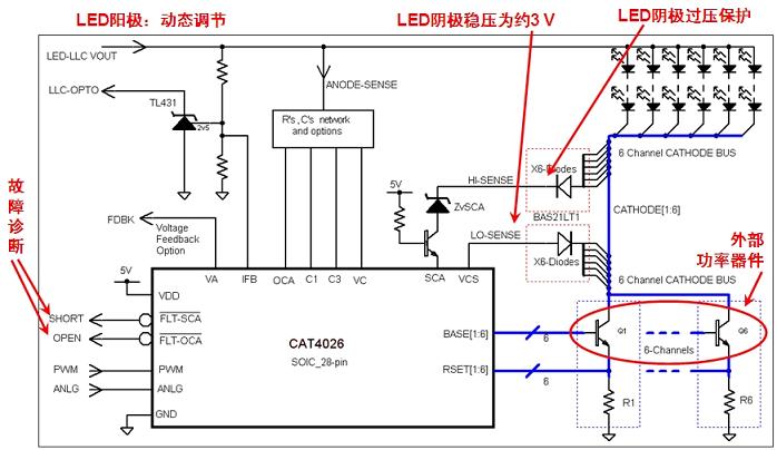 其它應(yīng)用,如建筑物照明中,同樣可以采用安森美半導(dǎo)體的高能效LED驅(qū)動(dòng)方案,如CAT4103、CAT4109三通道線性恒流驅(qū)動(dòng)器是高亮度RGB LED驅(qū)動(dòng)器,應(yīng)用于新興的高亮度、高視覺(jué)沖擊力LED建筑物照明中的RGB LED像素控制。而CAT4106是多通道升壓型LED驅(qū)動(dòng)器,適合較大尺寸的通用LCD背光應(yīng)用,能夠驅(qū)動(dòng)多達(dá)40個(gè)白光LED,提供總計(jì)達(dá)6 W的LED輸出功率,并幫助設(shè)計(jì)人員提升背光能效至最高。此外,采用LED背光的大尺寸液晶電視日趨多,其中尤以側(cè)光式LED背光為主,通常需要采用6個(gè)單串的LED光條(每串LED視為一個(gè)LED道)?,F(xiàn)有6通道側(cè)光式LED電視中每個(gè)LED通道均含有專用驅(qū)動(dòng)器IC、電感型DC-DC升壓轉(zhuǎn)換器及及開(kāi)關(guān)。而安森美半導(dǎo)體應(yīng)用于大尺寸側(cè)光式LED背光液晶電視的多通道線性LED驅(qū)動(dòng)器CAT4026是一種高性價(jià)比方案,支持高數(shù)量的通道,能以單顆IC控制6個(gè)LED通道,能效目標(biāo)范圍高于90%,能效典型值量多達(dá)94%,且針對(duì) LED開(kāi)路和過(guò)多LED短路等故障條件提供保護(hù)。CAT4026的簡(jiǎn)略應(yīng)用示意圖參見(jiàn)圖2。