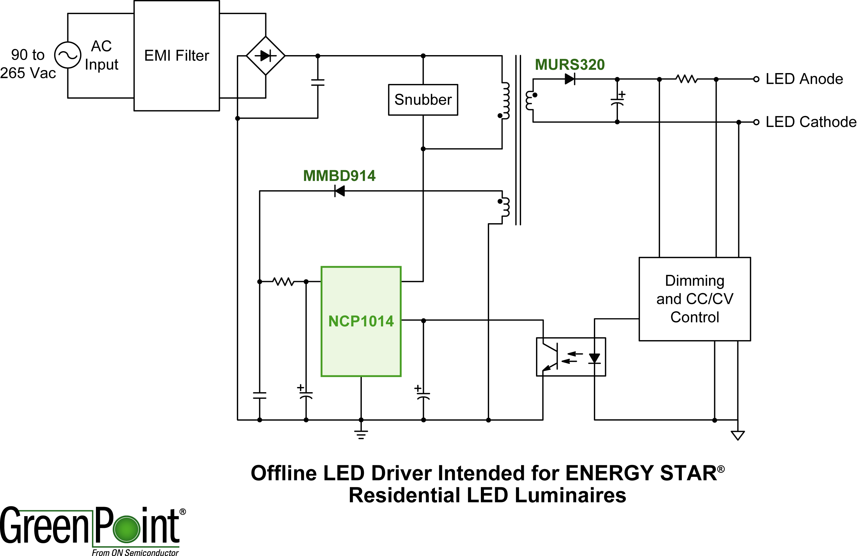 安森美半導體的另一款針對“能源之星”住宅LED照明的離線型LED驅動器GreenPoint®參考設計經(jīng)過優(yōu)化,驅動便攜臺燈、櫥柜內照明及戶外走廊燈等應用中的1到8顆大功率LED。這參考設計采用新穎的電路配置,無須增加額外的無源功率因數(shù)校正(PFC)網(wǎng)絡,即可在115 Vac條件下提供高于0.85的功率因數(shù),減少了元器件數(shù)量,并輕松滿足住宅LED應用功率因數(shù)要求。這設計支持90 Vac至265 Vac的通用輸入電壓工作,采用安森美半導體集成了固定頻率電流模式控制器和700 V MOSFET的NCP1014開關穩(wěn)壓器集成電路(IC)。