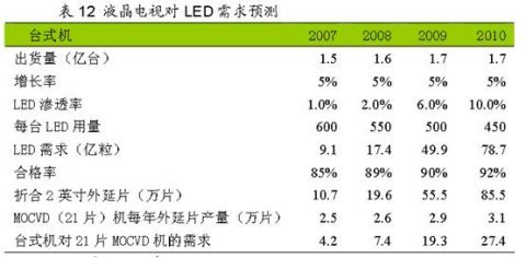 表4 臺(tái)式電腦液晶顯示器對(duì)LED需求預(yù)測(cè)