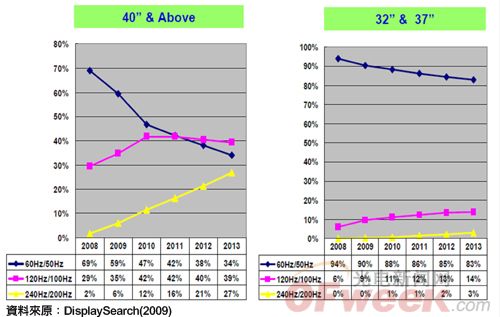 DisplaySearch預(yù)估,減少動(dòng)態(tài)模糊(Motion Blur)、達(dá)成品牌區(qū)隔、消費(fèi)者喜好及提高毛利率將為帶動(dòng)120Hz、240Hz液晶面板需求的主要?jiǎng)恿?,觀察32寸、37寸及40寸以上液晶面板,50Hz/60Hz比重明顯下降;反之,120Hz/240Hz比例有上升趨勢(shì),尤其在40寸以上最為明顯(如圖1)。
