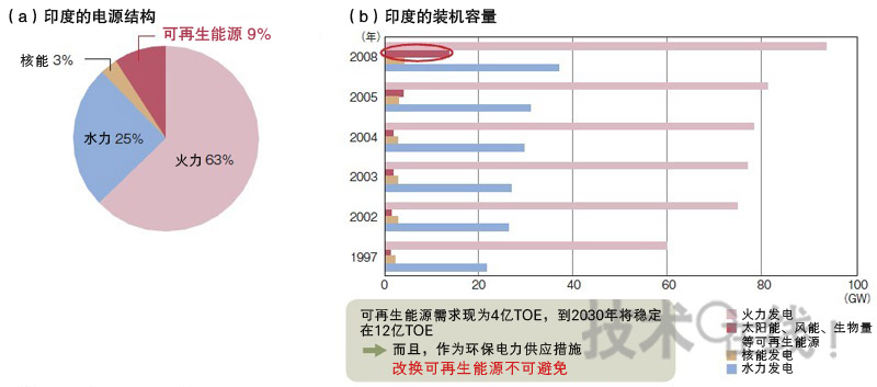 圖2:火力發(fā)電占主流印度各發(fā)電方式的裝機容量結構比與變化。火力發(fā)電,尤其是煤炭火力發(fā)電占壓倒性優(yōu)勢。從穩(wěn)定供電和環(huán)保角度出發(fā),改用可再生能源已刻不容緩