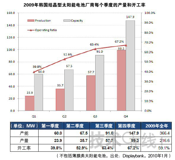 Displaybank稱,韓國廠商設(shè)備開工率的上升,主要得益于以德國為中心的歐洲市場上太陽能電池需求的改善。不僅是設(shè)備開工率,生產(chǎn)能力也得到了大幅上升。具體而言,產(chǎn)能由2009年第一季度的60MW,迅速攀升至2009年第四季度的147.9MW。Displaybank預(yù)測,如果今后繼續(xù)保持這一趨勢,2010年第一季度的開工率將提高至70%。