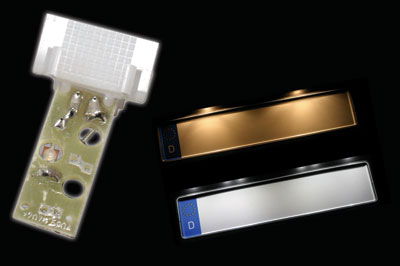 如圖2所示,光線可以從安裝在小尺寸PCB板上的表面貼裝LED器件發(fā)出,并使用限流電阻和反極性保護(hù)二極管。光線被直接照到簡單或精心設(shè)計(jì)的導(dǎo)光管上,這是約束光線的極其簡單方法。比較常用的方法是用適當(dāng)?shù)?ldquo;透鏡”或投光面體,安裝方法也經(jīng)常是在轎車內(nèi)部把它夾進(jìn)車門嵌板開口的地方、中央控制臺或儀表盤上。