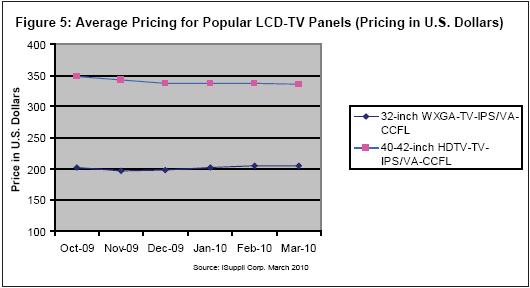 圖5所示為2009年10月至2010年3月流行液晶面板的平均價格走勢。另外,面板價格較高,也影響了品牌電視廠商的利潤率。因此,預(yù)計較高的庫存水平還將保持兩到三周,這將導(dǎo)致電視面板需求速度下降。