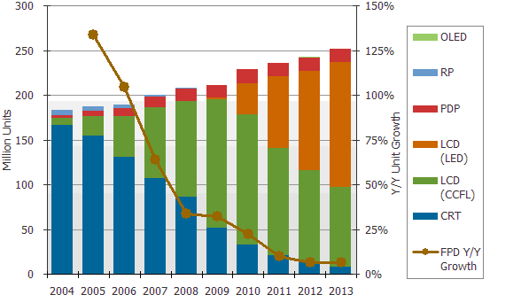 整體平面電視市場2009年表現(xiàn)相當亮眼,全球出貨量成長超過32%,與2008年的成長率相當接近。盡管受到經濟蕭條影響,某些區(qū)域市場如日本和中國大陸2009年成長率還比2008年好。對于2009年良好市場表現(xiàn),DisplaySearch認為新顯示技術如3D 與LED推出有正面刺激作用;同時上修2010年全球電視出貨量預測,預估今年將達2億2千800萬臺,較先前預測增加1千萬臺。