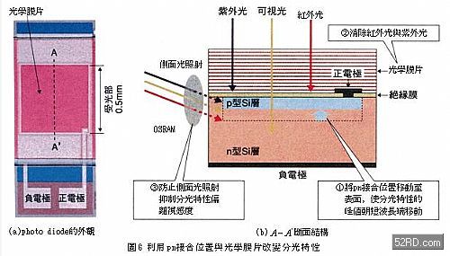 如圖6所示,分光特性可透過照度感測元件結(jié)構(gòu)上的改良獲得調(diào)整,基本上它是改變的接合位置(吸光產(chǎn)生電力),同時配合分光特性的峰值利用光學濾光片(filter)去除紫外光與紅外光。新日本無線根據(jù)上述動作原理進行分光特性最佳化設(shè)計,再以光罩(mask)遮斷從光二極管側(cè)面入射的光線,藉此捨棄光學濾光片傳統(tǒng)結(jié)構(gòu);德國OSRAM則採用新材質(zhì)與新結(jié)構(gòu),未使用傳統(tǒng)的改善對策,大幅提升照度感測元件的分光特性。