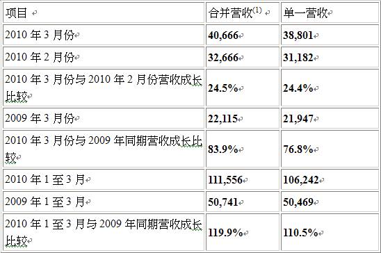 友達(dá)光電2010年3月份合并營業(yè)額達(dá)新臺幣四百零六億六千六百萬元,營業(yè)額較2月份成長24.5%,更較去年同期增加83.9%。累計(jì)2010年第一季合并營業(yè)額為新臺幣一千一百一十五億五千六百萬元,較2009年第四季僅減少2.9%,但與2009年同期相比,則大幅增加119.9%。