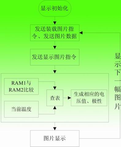 APOLLO驅(qū)動電子紙顯示的操作流程如圖4所示。電子紙的顯示依據(jù)是要顯示的圖片與當前顯示圖片相比較,得出其差值,再根據(jù)當前溫度查詢對應(yīng)的數(shù)據(jù)表格,依相應(yīng)數(shù)據(jù)輸出驅(qū)動。因此在上電后需對電子紙進行顯示初始化,這樣后續(xù)的圖片顯示就有較好的基準值。顯示初始化后RAM1數(shù)據(jù)全置為1,第一幅圖片數(shù)據(jù)存于RAM2,顯示第一幅圖片時將RAM2與RAM1進行比對,查表顯示輸出;第二幅圖片數(shù)據(jù)存于RAM1,顯示第二幅圖片時將RAM1與RAM2(存儲當前圖片)進行比對,查表顯示輸出,RAM1即存儲當前圖片;下一幅要顯示的圖片存儲于RAM2中,依次類推,循環(huán)執(zhí)行即可輸出要顯示的畫面。