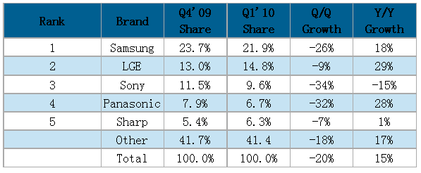 以出貨金額來看,索尼(Sony)掉出了前三名,同時出貨金額市占率下滑到10%以下。索尼去年第四季在前五大廠商中出貨金額成長勢居于領(lǐng)先位置,不過第一季卻是惟一一家廠商出貨金額下滑的。Panasonic與Sharp分別排名第四與第五名。