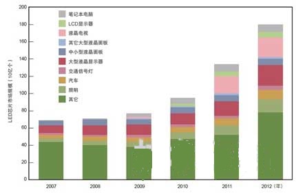 圖中為分用途的LED市場預測。設想到2012年以前,LCD TV市場將以年率120%增長。圖由依DisplaySearch的資料所制。