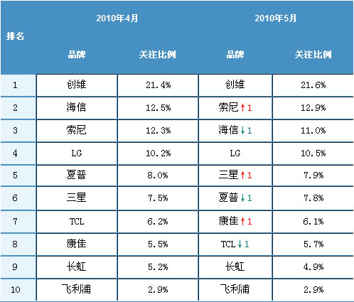 (圖)2010年5月中國液晶電視市場最受用戶關(guān)注的十大品牌