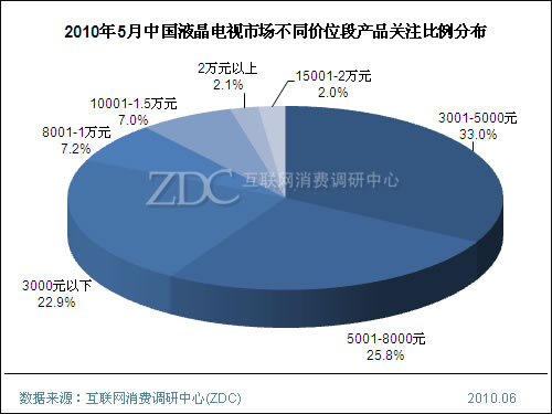 5月,3001-5000元的液晶電視產(chǎn)品吸引了33%的消費(fèi)者關(guān)注度,較上月升高了0.5%,而3000元以下的入門級液晶電視產(chǎn)品吸引了22.9%的消費(fèi)者關(guān)注度,較上月提高了2.6%。而5001-8000元價(jià)位段的大中尺寸液晶電視的消費(fèi)者關(guān)注比例較上月減少了4.1%。