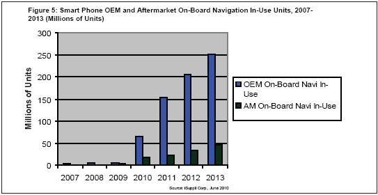 iSuppli公司預測,隨著智能手機在未來10年成為戰(zhàn)略性計算平臺,2010年基于智能手機的OEM和售后市場on-board導航系統(tǒng)使用量預計增長九倍,2014年有望增長到近40倍。