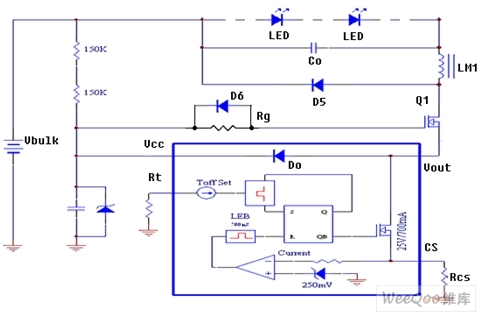 圖5是源極驅(qū)動(dòng)控制電原理路,從中可見(jiàn)BP2808內(nèi)部的低壓開(kāi)關(guān)MOS管(700mA)漏極連接到外部功率開(kāi)關(guān)MOS管Q1的源極,而其源極連接到采樣電阻RCS的一端以及第一比較器的輸入端,其柵極連接到RS觸發(fā)器的輸出端。外部功率開(kāi)關(guān)MOS管Q1的漏極輸出電流經(jīng)儲(chǔ)能電感直接驅(qū)動(dòng)LED光源。芯片內(nèi)的Do是饋流二極管,在BP2808啟動(dòng)工作后,從OUT到VCC的饋流經(jīng)Do整流向BP2808提供工作電源。