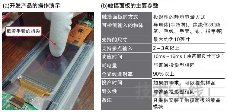 除了可以用絕緣物輸入的特點(diǎn)以外,在具有10ms~16ms的響應(yīng)時(shí)間、90%以上的全光線透射率以及耗電量和耐久性等方面,此次開(kāi)發(fā)的產(chǎn)品與普通的投影型性能相同。在檢測(cè)控制方面,可使用原來(lái)用于投影型的控制器IC。