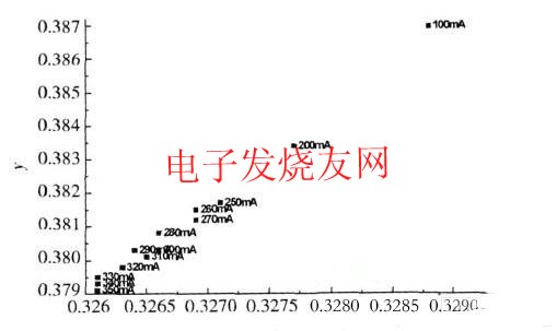 現(xiàn)在LED的發(fā)光顏色越來越豐富,LED的色坐標參數(shù)是LED重要的物理參數(shù)之一,隨著注入電流的增加,器件出光的色坐標在一定程度上減小,如圖1所示。