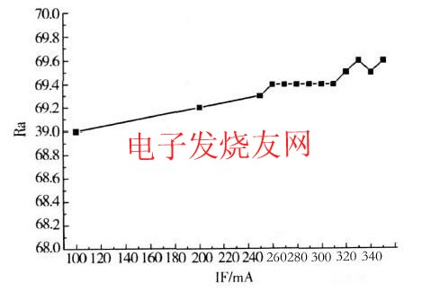 由于藍光LED與$熒光粉組成的白光系統(tǒng),其光譜中缺少紅光成分,顯色指數(shù)還不理想,這也是目前業(yè)界研究的重點課題。顯色指數(shù)與光譜成分有關(guān),電流增加但并不影響出光的光譜的分布,所以器件的顯色指數(shù)幾乎沒有變化。