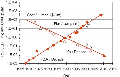 上述的講法聽來有些讓人疑惑,今日不是一直強調LED的亮度突破嗎?2003年LumiledsLighting公司RolandHaitz先生依據(jù)過去的觀察所理出的一個經驗性技術推論定律,從1965年第一個商業(yè)化的LED開始算,在這30多年的發(fā)展中,LED約每18個月;24個月可提升一倍的亮度,而在往后的10年內,預計亮度可以再提升20倍,而成本將降至現(xiàn)有的1/10,此也是近年來開始盛行的Haitz定律,且被認為是LED界的Moore(摩爾)定律。
