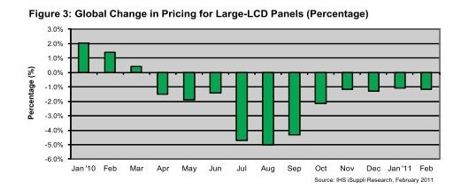 據IHS iSuppli公司的研究,由于需求疲軟和庫存上升,2月份大型液晶顯示器(LCD)面板價格繼續(xù)下降,但到4月份這種情況可能會有所改善,因屆時品牌廠商會增加購買電視面板。