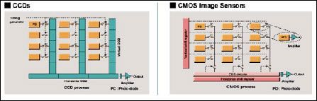 而現(xiàn)在普遍使用的兩種圖像傳感器就是大家經(jīng)常聽說到的CMOS和CCD傳感器了,為了讓大家最終更好地認(rèn)識(shí)背照式CMOS傳感器,小編在此也簡單說一下兩種傳感器的異同以及優(yōu)缺點(diǎn)。如下圖所示,左邊為CCD傳感器的結(jié)構(gòu),右邊的為CMOS傳感器的機(jī)構(gòu),黃色的小方塊為像素點(diǎn)。由圖示可以看出,CCD傳感器中每一行中每一個(gè)象素的電荷數(shù)據(jù)都會(huì)依次傳送到下一個(gè)象素中,由最底端部分輸出,再經(jīng)由傳感器邊緣的放大器進(jìn)行放大輸出;而在CMOS傳感器中,每個(gè)象素都會(huì)鄰接一個(gè)放大器及A/D轉(zhuǎn)換電路,用類似內(nèi)存電路的方式將數(shù)據(jù)輸出。簡單說就是對(duì)待單個(gè)像素點(diǎn)上得到的電荷數(shù)據(jù)有不同方法,CCD是全部傳輸出來再統(tǒng)一處理,CMOS是先分別處理在傳出來。這兩種方式并不是人們憑空想象出來的,而是由CCD和CMOS的制作工藝決定的,因?yàn)镃MOS器件內(nèi)傳輸數(shù)據(jù)會(huì)有較高的失真,所以需要先做處理。