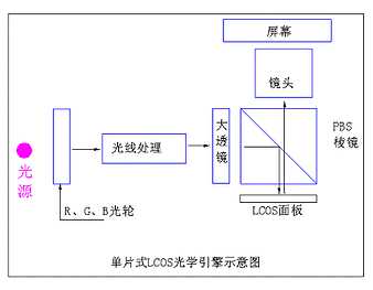 LCOS顯示面板其中一面以CMOS芯片為基板,無法讓光線直接穿過,因此采用穿透式成像方式,因此其背投光學系統(tǒng)和LCD背投影機便產(chǎn)生了區(qū)別。通常LCOS光學系統(tǒng)中需要利用偏極化分光鏡(PolarizationBeamSplitter:PBS),將入射LCOS面板的光線與反射的光線分開。PBS是由兩個45度等腰直角棱鏡底邊粘合的而成的棱鏡,當非線性偏極化光入射PBS時,PBS會反射入射光的S偏振光(垂直入射線平面),并且讓P偏振光(平行入射線平面)通過。關于LCOS光學系統(tǒng)技術仍在起步階段,所以IBM、ColorQuad、Philip、Hologram等多家廠商都開發(fā)了不同的LCOS光學引擎架構。但主要可分為單片式和三片式兩大類,如下:
