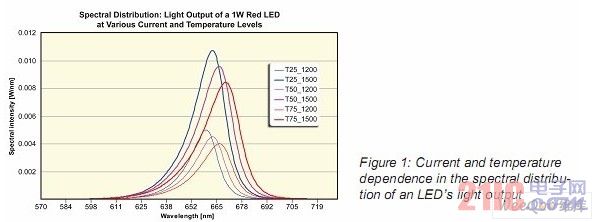 LED的光輸出特性主要取決于其工作條件。前向電流增加會(huì)使LED產(chǎn)生更多的光。但當(dāng)前向電流保持不變,光輸出會(huì)隨著LED的溫度升高而下降。圖1描述了溫度,電流和光輸出的關(guān)系。并且描述了一個(gè)LED相關(guān)的顏色光譜在峰值波長處的偏移。用于普通照明的單色LED,藍(lán)色光譜的峰值會(huì)發(fā)生偏移,因此改變了LED所謂的色溫。這會(huì)對LED照明空間內(nèi)的感官產(chǎn)生影響。