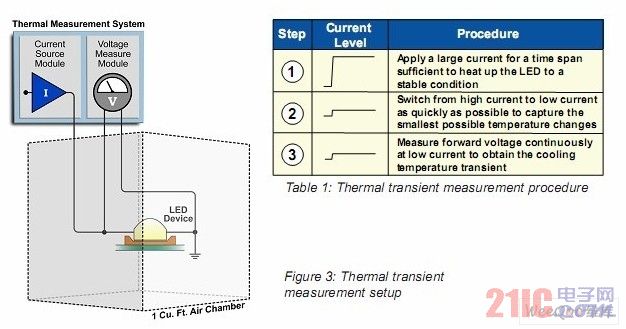 圖3描繪了此類測量裝置的簡圖(不成比例)。測量的第一步是確定前向電壓在一個(gè)非常小的電流下的溫度敏感性,這個(gè)小電流可以是傳感器或測量電流。之后,LED被施加一個(gè)大電流,從而使其變熱。接著停止施加大電流,并且很小的傳感器電流再次出現(xiàn),同時(shí)用一個(gè)高采樣率完成前向電壓的測量,直至LED結(jié)溫完全趨于穩(wěn)定。由于LED快速的熱響應(yīng),所以測量的硬件設(shè)備必須能夠捕捉LED電流停止施加后幾微秒內(nèi)的溫度(電壓)改變。如圖3所示,被測量的LED處于一個(gè)封閉空間內(nèi),這個(gè)封閉空間是JEDEC標(biāo)準(zhǔn)的自然對流腔,它提供了一個(gè)沒有氣流流通的環(huán)境。T3STer也可以提供類似的裝置。表格1歸納了測試步驟。