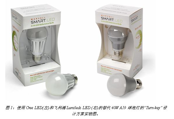 目前Marvell公司提供的超低功耗A19型交鑰匙設計方案和燈泡實物包括兩種(見圖1),均可用于替代40W的A19型球泡白熾燈:一種是采用4顆照明級別Cree XLamp® XP-E高效白光LED的方案;另一種是采用飛利浦Lumileds LUXEON® A LED的方案。此外,Marvell還推出了采用Cree XLamp® MT-G產品的PAR38射燈交鑰匙解決方案,用于替代100W的傳統(tǒng)此類燈具。同時,Marvell還在開發(fā)A19 60W等效LED燈泡方案,很快也將與中國客戶見面。