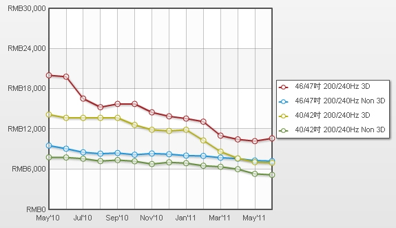 觀察2011年6月大陸3D TV相對2010年12月均價跌幅,以40/42寸、46/47寸、52/55寸3D TV跌幅大于全球,主因上述尺寸價格競爭較為激烈。