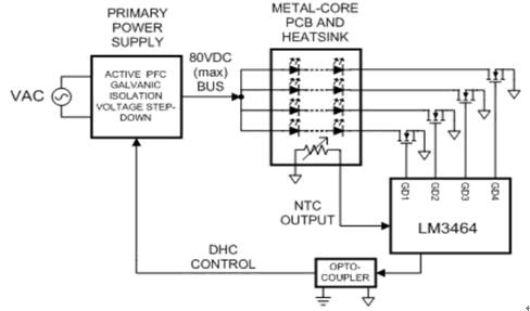 此外,本文還將給出另外一種實(shí)現(xiàn)方法的結(jié)構(gòu)示意圖,即采用隔離式AC/DC電源及一款具有動(dòng)態(tài)余量控制的LM3464。通過(guò)避免電磁干擾,該方案具有極高效率。