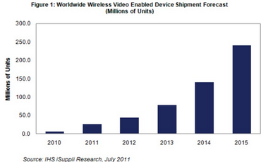 這類支持無線視頻的設(shè)備包括智能手機(jī)、筆記本電腦和媒體平板,2015年出貨量將從2010年的660萬個增長到2.411億個,復(fù)合年度增長率高達(dá)105.1%,如圖1所示。