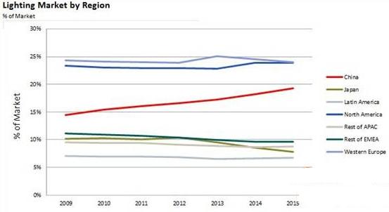 經濟發(fā)達地區(qū)比如北美和歐洲將會是照明市場增長的主要區(qū)域,將會占到50%左右的市場份額($US)。2010年,中國占到全球照明市場的14%,2015年預計會增至20%。持續(xù)的經濟增長,建設熱潮,對于電力消耗增大的擔憂以及公眾購買能力的提升會影響該區(qū)域的市場。