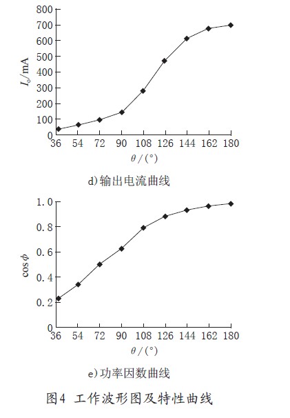 圖4d)為可控硅不同導(dǎo)通角對應(yīng)的輸出電流曲線,實(shí)際調(diào)試中可控硅導(dǎo)通角在150°之后就接近滿載輸出了。圖4e)為可控硅在不同導(dǎo)通角下對應(yīng)電路的cosφ曲線。