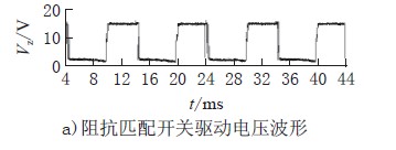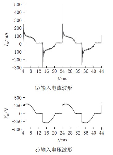 圖4a)、b)、c)為可控硅導(dǎo)通角為115°時阻抗匹配開關(guān)驅(qū)動電壓VZ、輸入電流Iin、輸入電壓Vin的波形,電路的輸出電流為470mA,功率因數(shù)為0.78。從圖中可看出,當(dāng)可控硅導(dǎo)通瞬間,由于驅(qū)動器輸入端有差模濾波電容導(dǎo)致輸入電流有沖擊電流尖峰,而當(dāng)輸入電流小于一定值時,阻抗匹配開關(guān)開通以保證流過可控硅的電流大于其維持電流。