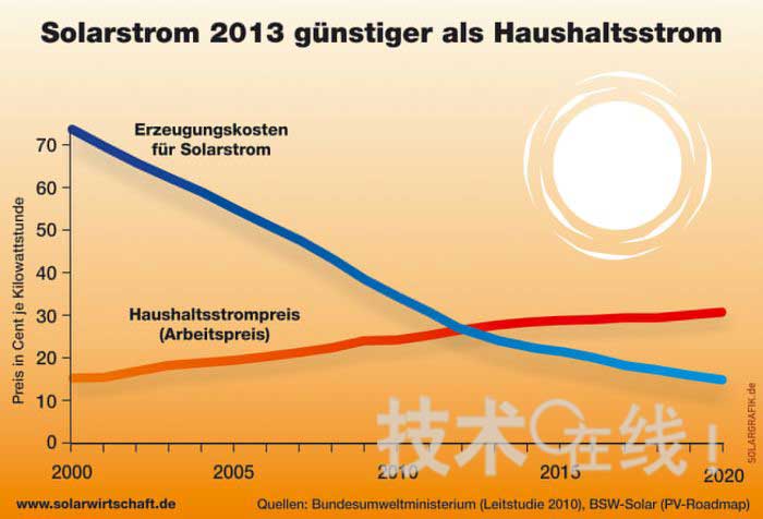 圖2:到2013年,太陽能發(fā)電成本將低于家庭電費。圖為德國太陽能發(fā)電的發(fā)電成本(藍(lán)線)與家庭電費(紅線)的比較。