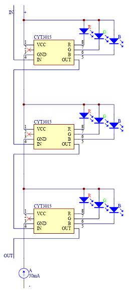 根據(jù)CYT3005單線傳輸驅(qū)動全彩LED燈設(shè)計圖,我們可以看出,單總線傳輸設(shè)計上顯得很簡單,這也是工程上最需要的傳輸方式。