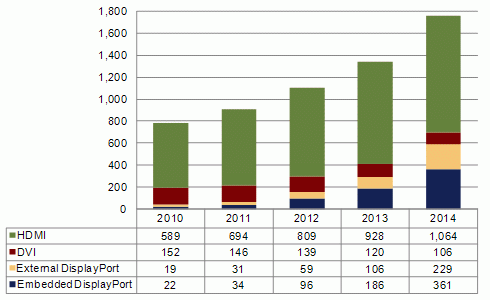 去年In-Stat 觀察到HDMI在移動(dòng)消費(fèi)性裝置上有快速成長(zhǎng),例如手持式高清攝影機(jī)、數(shù)碼相機(jī)等。而在電腦的部分,今年起HDMI在移動(dòng)電腦 (包含筆記本電腦、上網(wǎng)本和平板電腦等)、繪圖卡、以及電腦顯示器等等的搭載比重正不斷攀升。根據(jù)In-Stat最新的PC/Display Interface By Device, Q4’11 Forecast (電腦與顯示器接口統(tǒng)計(jì)數(shù)據(jù)庫與預(yù)測(cè))報(bào)告指出,2011年搭載有HDMI接口的移動(dòng)電腦的數(shù)量為1億4千8百萬臺(tái)(包括筆記本電腦、上網(wǎng)本和平板電腦等),相較于2010年的1億零3百萬臺(tái)的出貨成長(zhǎng)了43%;而在移動(dòng)電腦不斷強(qiáng)調(diào)高分辨率多媒體數(shù)字娛樂播放的趨勢(shì)之下,預(yù)計(jì)2014年搭載有HDMI接口的移動(dòng)電腦的數(shù)量將可達(dá)3億臺(tái)以上。另外,Embedded DsiplayPort的接口成長(zhǎng)亦十分快速,搭載有Embedded DisplayPort的移動(dòng)電腦裝置預(yù)計(jì)將由2010年的8百萬個(gè)快速成長(zhǎng)到2014年的3億個(gè)以上。