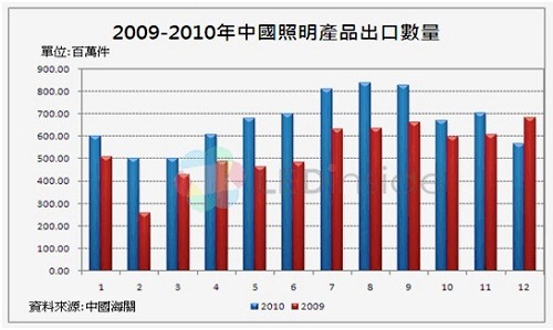 集邦科技旗下研究部門 LEDinside 研究指出,中國目前已成為照明燈具產品的制造大國,將近70%的照明產品都是由中國地區(qū)所生產,以白熾燈來說更是如此。LEDinside調查指出,2010年白熾燈、鹵鎢燈、(緊湊型熱陰極)螢光燈與其他燈具的每月平均出口數(shù)量達6.67億件,金額達11.40億美元;總計2010年出口數(shù)量達79.9億件且金額達136.77億美元,相較於2009年,數(shù)量成長24.2%,且金額成長34.7%。