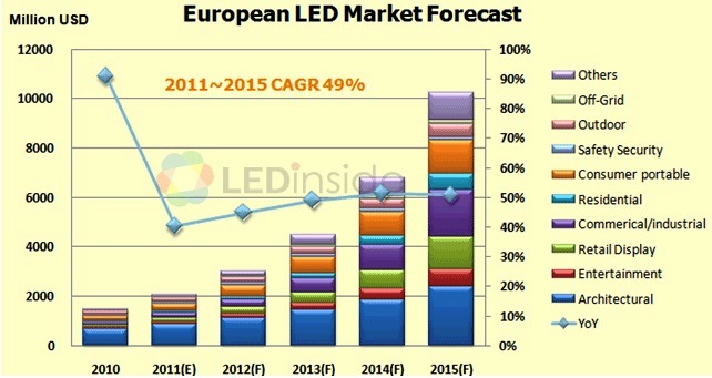 根據(jù)LEDinside調(diào)查, 2011年歐洲 LED照明市場約達(dá)20億美元以上,大約占全球 LED照明市場28%。盡管歐洲市場因?yàn)闅W債而在 2011年有受到影響,但歐盟已經(jīng)積極解決,也反應(yīng)在市場上,隨著LED規(guī)格不斷的提升及大幅度降價等影響,LEDinside預(yù)估歐洲 LED照明市場每年都將會有大幅度成長,2015年歐洲 LED照明市場將會突破100億美元規(guī)模。