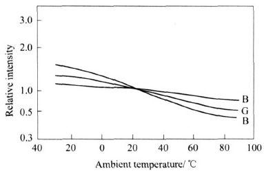 但從LED 的亮度特性圖3 可知,隨著環(huán)境溫度TC 的變化,L ED 的RGB 三基色的顯示亮度偏移狀況各不相同,B 的飄移較小,而R 的飄移較大,當(dāng)溫度超過80 ℃時,R 相對亮度的變化幾乎是常溫時的2 倍。這種變化完全破壞了常溫時設(shè)置的白平衡,使整個顯示屏的色度發(fā)生嚴(yán)重漂移,圖像質(zhì)量變差。RGB 三基色的相對亮度的偏移如圖4 示,可明顯看出,常溫時三基色的亮度狀態(tài)和在85 ℃及- 20 ℃時的相對亮度值,正是L ED 的溫度特性導(dǎo)致冬季和夏季顯示屏的圖像質(zhì)量變差。