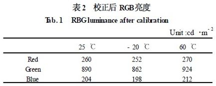 表1 中,常溫的白場配色比例為1. 92 ∶6. 57 ∶1. 51。而當(dāng)溫度發(fā)生變化時,由于LED 的特性,使RGB 的亮度特性發(fā)生了嚴(yán)重的偏移,使白場的比例已完全偏離了常溫下的比例,使圖像在色彩發(fā)生了畸變。而采用本文的校正技術(shù)后,結(jié)果如表2 所示。