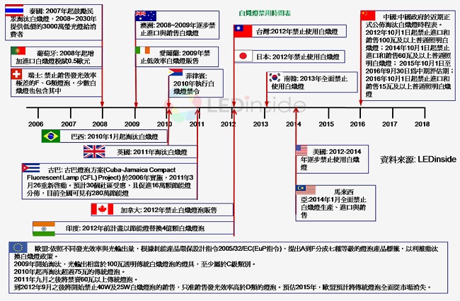 各國(guó)禁用白熾燈泡時(shí)程比較表