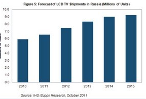 據(jù)IHS iSuppli公司的電視研究報(bào)告,隨著青睞先進(jìn)電視技術(shù)的中產(chǎn)階級(jí)不斷壯大,今年俄羅斯液晶電視出貨量預(yù)計(jì)強(qiáng)勁增長10%。俄羅斯屬于所謂的金磚國家(BRIC),是一個(gè)重要市場(chǎng)。
