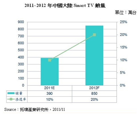 - 2012年中國(guó)大陸Smart TV銷售量將達(dá)850萬臺(tái)